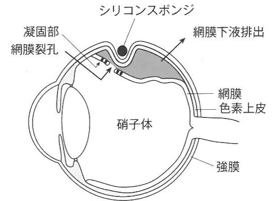 網膜液下を排出したりスポンジで眼球を凹まして網膜を下の組織に引っ付けます。