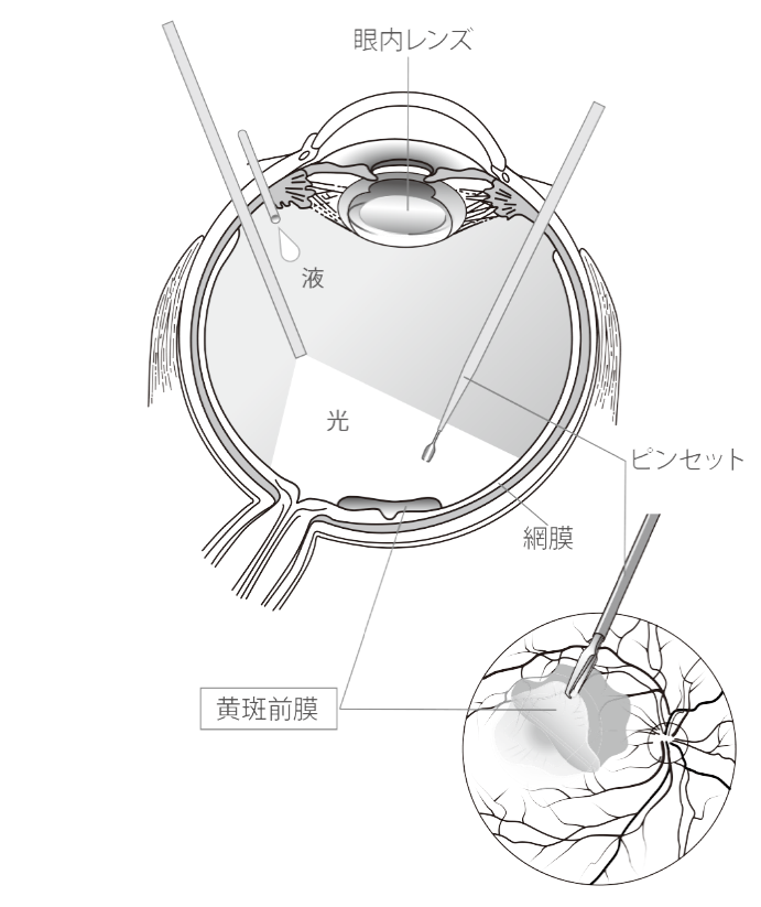 硝子体手術は、白目に小さな穴を開けて、硝子体を取り除いた後に、網膜の表面に張り付いている黄斑前膜をピンセットで丁寧に取り除きます。すでに白内障も進んでいる場合は、白内障手術も同時にすることができます。